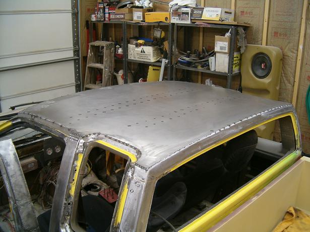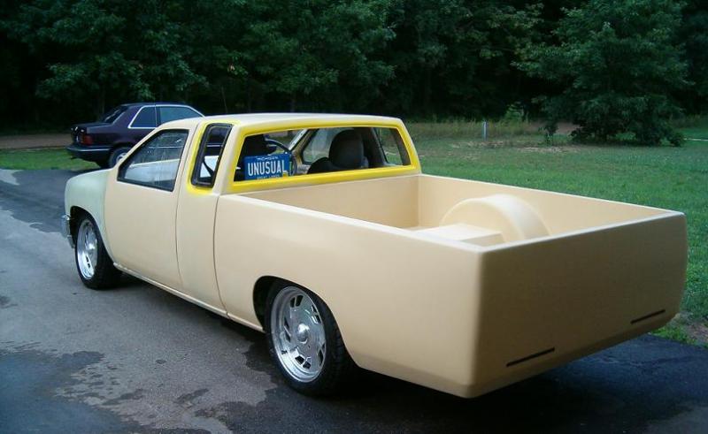 Cab height is 45.5 inches. Rolled fender lips. 2 3/4 inch bodydrop, 5 inch choptop. Shaved handles, mirrors, Nissan emblems, antenna, bodyline, windshield squirters, completely shaved rear-end, cowl, gas filler door, corner markers, re-skinned roof, and smooth firewall. Currently primer on the outside, motor compartment is painted "Dimont" organic yellow over white sealer. Other accessories include a chrome toyota bumper and valence and suicide doors with Bear Claw latches. The inside of the bed is hand fabbed out of 1"x1" square tubing, sheetmetal, and wheel tubs. Two 12 inch L.E.D's are located in the tailgate skin. The brake booster and master cylinder were relocated under the bed and the all the brake lines are stainless steel. I cross drilled the rotors at work on the CNC machine. New tubs were built into the front to replace the old inner fenders. Custom tubular core support. Mud, primer, and paint by JB.