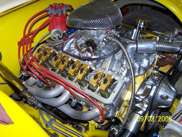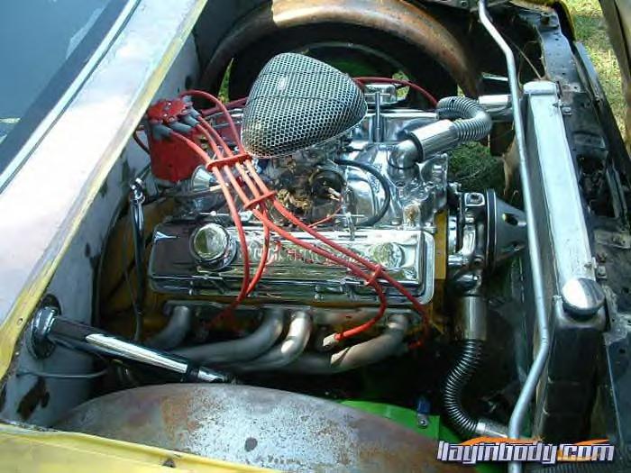 Rebuilt Chevy small block 350 bored .040" over, 58cc aluminum HO heads, Crane Cams aluminum roller rockers, hardened guide plates, Crance Cams hardened puch rods, "Edelbrock Performer" polished intake manifold, 600 cfm electric choke carburetor, camshaft, valve springs, Pete Jackson gear drive, ported and polished heads, stainless steel "Lokar" thottle and kickdown cables, chrome throttle bracket and return springs, stainless steel braided oil dipstick, "Proform" chrome valve covers, valve cover hold downs, breathers, chrome timing chain cover, chrome fuel pump block-off plate, chrome oil pan, chrome heavy duty starter, "Summit Racing" polished aluminum pulleys, ceramic coated "Hedman" hedders, 3 inch "Flowmaster" exhaust, "MSD" pro billet distributor, 6A ignition box, blaster SS coil, 8.5mm plug wires, Moroso wire looms, and a polished stainless steel bolt kit for the motor. Rebuilt TH350 transmission, also painted, with a shift kit and a 2000 rpm stall convertor with chrome transmission pan, "Lokar" stainless steel braided dipstick, stainless steel bolts, and chrome inspection plate. Cooled by a frame rail mounted transmission cooler. 20 gallon aluminum fuel cell with steel braided line and "Earls" fittings, "Holley" Red electric fuel pump. "Summit Racing" aluminum radiator, "Billet Specialties" polished aluminum radiator cap, chrome short water pump, stainless steel flexible radiator hose, "Perma-cool" 16" electric fan, and polished thermostat housing, "Goza" aluminum recirculating catch can. Red "Energy Suspension" motor mounts, transmission mounts, and control arm bushings.