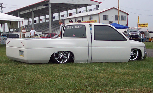 white epoxy primer, chrome front end, clear corners and bumper lights, shaved- hood emblem, hood pissers, rooflines, 3rd brake light, antenna, pass side door handle and lock (driver side when i get my shaved door kit), taillights.....fullskin combo, LEDs, frenched plate box, grafted 4x4 front fenders into bed with added peice of old 2wd fenders to bring the fender back down to stock again, flared the bed another 1".....no bed floor, just tubing runnin all over the place for now....bodydropped 3", pass side door suicided