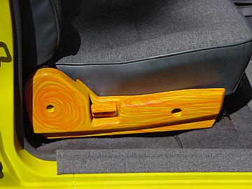 grey tweed, with 3d graphics in the doors, billet steering wheel with a few other pieces of billet