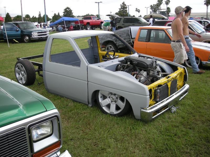 currently a boxed nissan . Alittle in this box alittle in that box. othr than that i've only got a cab right now sold the bed for parts.I've shaved corner lights, handles,locks,antenna smooth back wall, shaved and customized wipper cowl,mirrors, and i'm working on the roof next. 3.5in BD cowl ind hood shaved hood vents and squirters 95 grille, 97 chrome bumper tubbed for 20's suicide doors