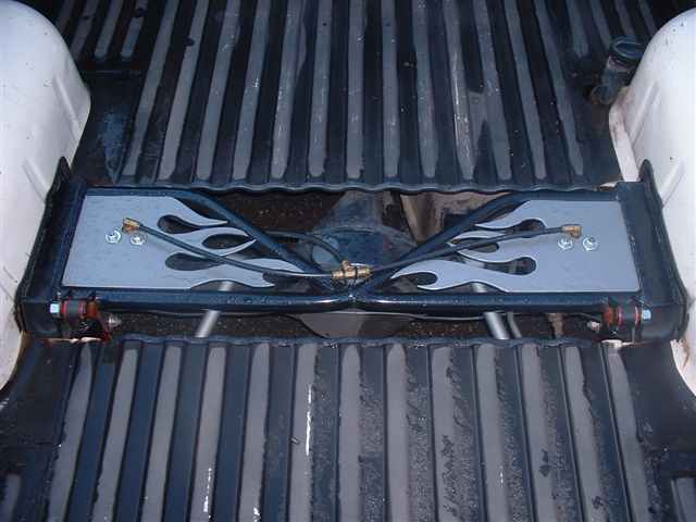 Firestone 2500 bags with flamed rear mounts. Electric 3/8" F/B, 5 gallon tank, a thomas(Firestone) and adjustable pressure switch. Reverse 4-link. Stepnotched, Spindles, all suspension done at Brislands.