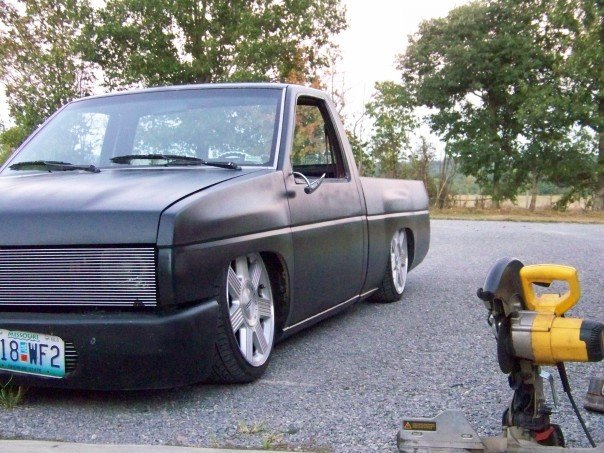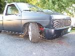 freshly sprayed black primer,shaved doors, wiper cowl, clear corners, fenders been cut down for shaved toyota front bumper with a crooked plate and billet piece, gas tank door, full skin with flamed tail lights, crooked plate, new chrome mirors