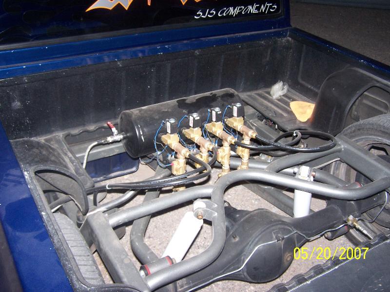 full custom built frame, frame and suspension powder coated raw steel silver with jamacian blue clear coat, bagged off four link with two to one lift ratio, 3/8 single port bags, half inch 470 psi valves/co2
