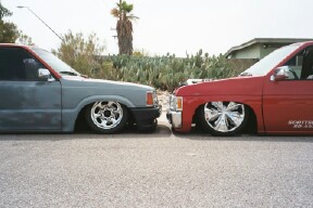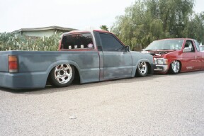AIM (crap) Spindles, Air Bags , Toyota 5lug all the way around Finally got the 4 link in, still waiting on the torsion bar bag mounts. All air shit is relocated. it is coming along slowly