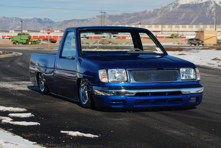 Bagged front and rear. Relocated front strut bars, 4-Link and bags over the axle in the rear.