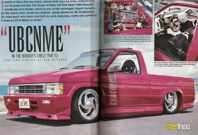 Paint House of Kolors Hot Pink Pearl, Xenon bodykit with fender flares. 1990 chrome nissan pathfinder grille. 1995 nissan hardbody hood. H.I.D. Street Beat ragtop. Shaved door handles. Altezza taillights & clear turn signals. Frenched in license plates. Shaved tailgate handles. Rhino Linings bedliner