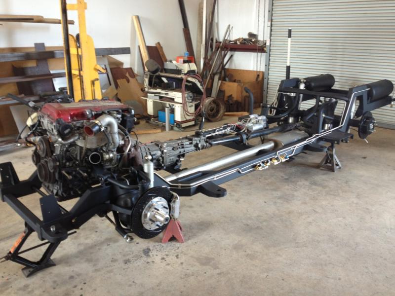 Fully custom built chassis by Jimmy's Rod and Custom, front sway bar, sleved bags in the rear