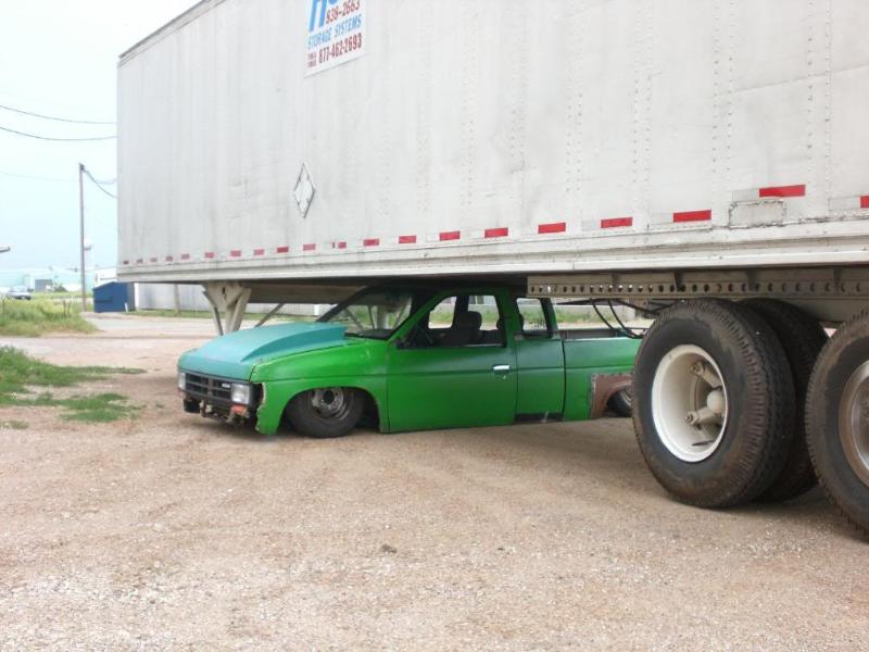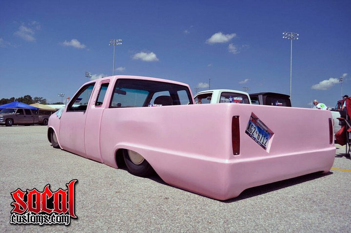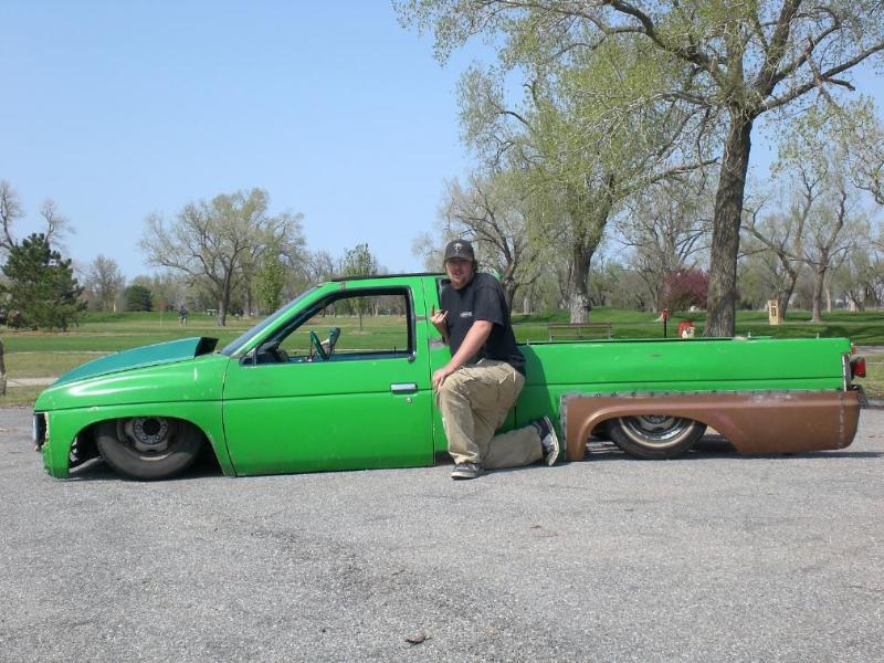 1 1/2 chop top body drop to the doors (6") 63 ford lower bedsides shaved 3rd brake light emblems gas door and cowl vents now has custom side windows for the ex cab shaved bodylines on fenders sofar shaved corner lights and handmade front rollpan with frenched bullit turn signals pancaked hood mo;ded fenders to cowl roll pan and front part of hood to make it a one peice clip mirrors shaved one off roll pan made for the rear to match the ford bedsides 63 ford tail lights frenched in tag angled tag box front wheel openings re shaped to better match the frod bed sides body line and door handels shaved along with wipers s10 cowl hood scoop sectioned 7 inches to fit on the nissan hood
