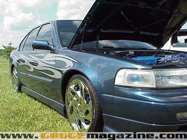 completely shaved, stillen body kit, custom made front lip, billet grill, clear corners, custom mixed blue paint with 9 pearls. 5% and 5 over 5% window tint with a 12" black vynal strip in front