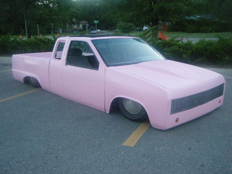 1 1/2 chop top body drop to the doors (6") 63 ford lower bedsides shaved 3rd brake light emblems shaved one off roll pan made for the rear to match the ford bedsides 63 ford tail lights frenched in tag angled tag box front wheel openings re shaped to better match the frod bed sides body line and door handels shaved along with wipers s10 cowl hood scoop sectioned 7 inches to fit on the nissan hood custom side windows for the ex cab shaved bodylines on fenders sofar shaved corner lights and handmade front rollpan