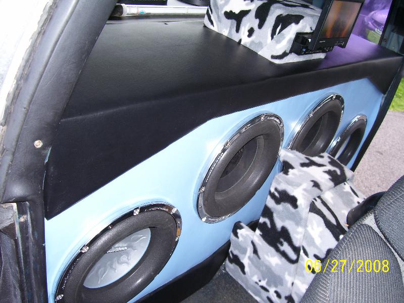 2 Stinger Batteries... Pioneer CD Player... 4 Audiobahn 6 1/2s... 4 Audiobahn 6x9s... Audiobahn 400 Watt Amp On The 6x9s... 6 Audiobahn 12s, 2 In The Trunk And 4 In The Back Seat... Audiobahn 800 Watt Amp On The 2 12s In The Trunk... Bazooka 2000 Watt Amp On The 4 12s In The Back Seat...