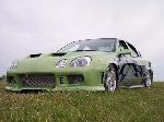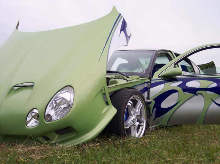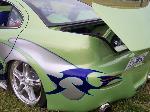 An eight toned paint job done by GB Customs. A full tilt front end (hood w/ ram air scoops, top half of fenders, and custom made front cover fiber glassed together) that contains Lexus GS 300 headlights. Also, hand made original side skirts and rear cover, shaved body lines, door handles, third brake light and antenna, color matched calipers, fog lights, shaved taillights, flip trunk, tilted and freched in license plate box, mirror swap from Eclipse, Sparco gas door, fiberglassed trunk insert painted, frenched license plate, custom name plate in trunk.