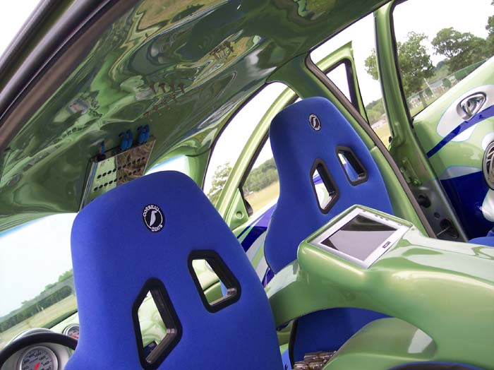 Fiberglassed painted dash with a Sony Playstation 2 in the glovebox. Autometer gauges in dash. Fiberglassed centerconsole with (2) tv moitors, Ignited push start, Ignited pilot toggle switches. Also a new raised 3” fiberglass floor with (4) amplifiers. Fibreglassed roof liner housing a 30 band EQ and air ride switches. (4) New door panels housing a total of (24) m-class speakers. Interior is configured around (4) Corbeau race bucket seats. In the trunk (3) Memphis m-class subs and a Memphis Belle amp that will power the subs and (2) sets of kick panels for SQ competition. And (4) cap’s to keep up the power.