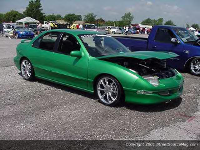 Del Sol green, shaved door handles (all 4), shaved antennea, shaved emblems, shaved ASS end(tail lights and middle plastic piece), shaved trunk lid, honey comb in front painted silver, airbrushed around pontiac symbol on hood, rear deck lid spoiler, , S-10 front bumper clears as tail lights, and Acura Imtegra clears in front