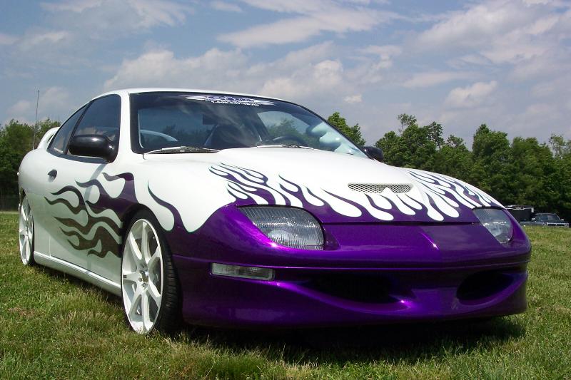 White with pearl purple in the clear with passion pearl purple flames.Wings West Super Style Wing, 35% window tint with custom graphics,ion blue headlights, purple neon underbody lights, Omega alarm system