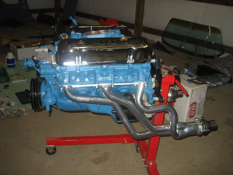 Pontiac 400 bigblock. Bored 30,000 over, with a racing cam. Highrise intake, with shaker. Headman headers, and Eldebrock valve covers.
