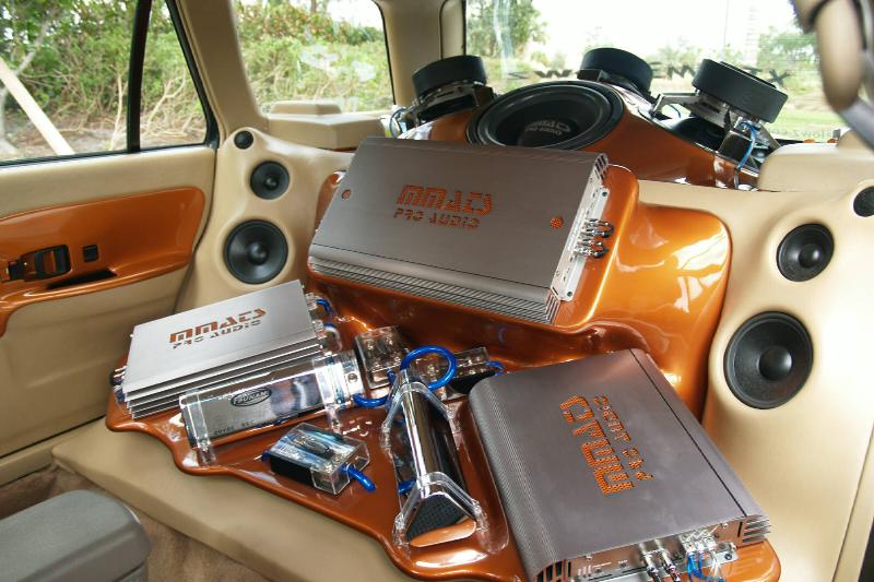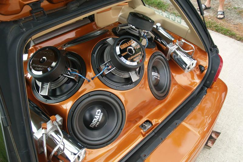 fiberglass sub floor, 4 12 inch kicker comps., alpine mrv1505 on bass, and a alpine mrvf405 on hishs and mids, boston pros, and a alpine head unit