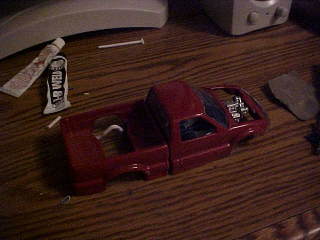 red, shaved doorhandles, tailgate handle, rollpan, body dropped.