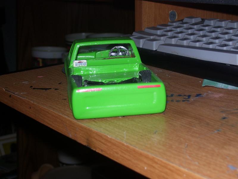 lime green paint,chrome grille an bumper,clear headlights,corners,an bumper lens,shaved wiper cowl,door handles,third brake light,gas door,tailights,fullskin combo ,bed is smoothed out,led tails.