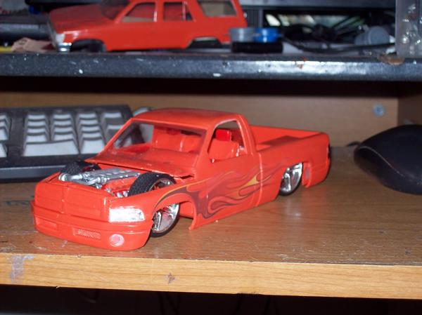 competition orange w/ red an yellow flames,shaved mirrors,doors,third brake light,gas door, fullskin w/ stock tail lights,sheetmetal bed, wheel tubs, an a custom hood to clear the 26s when its closed