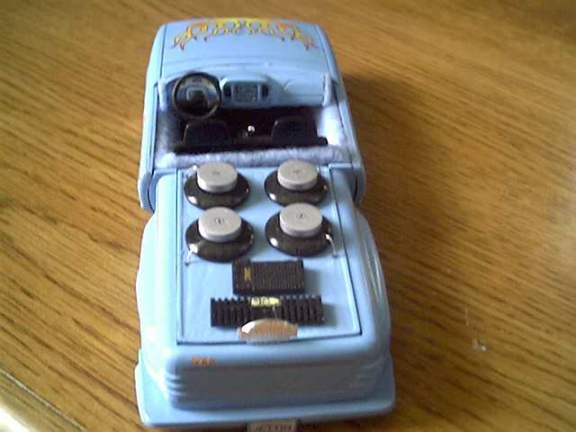 shaved headlights, all handles. painted baby blue. with flames.