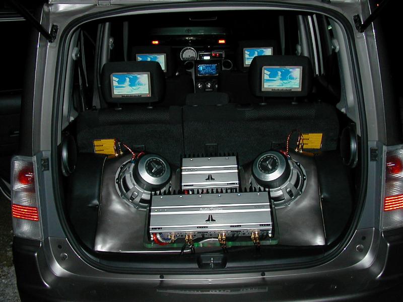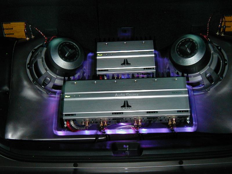 kenwood double din touch screen, 4 headrest, 2 JL w6 in a custom box, JL 250/1, JL 1000/5, both mounted on plexiglass with leds under to light up the glass.