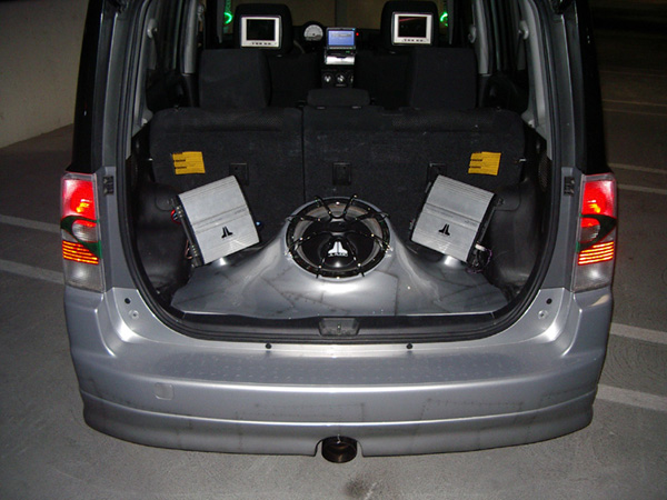 Alpine DVD w/ 6.5" screen in dash, Crystal separates in dash and doors, JL 12w3 in custom enclosure, powered by JL amps on floating racks over enclosure, 6.5" screens in front headrests.