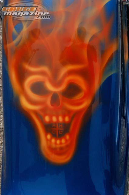 Shaved the emblems, taillights, license plate. Painted HOK Blue with Real Flames. Real Flame skull on rear fender.