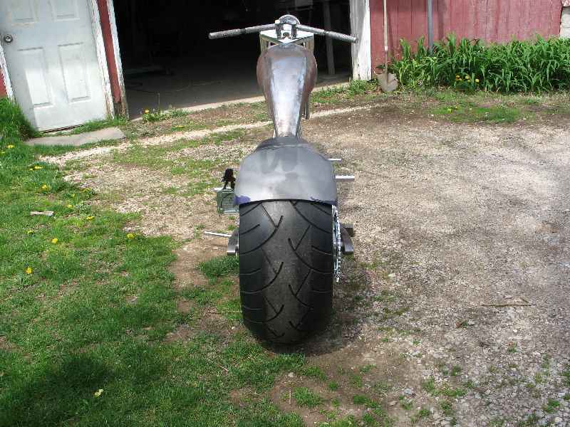 21" RIM AND TIRE UP FRON WITH A 18" BY 12" WIDE RIM WITH A 280 TIRE ON THE REAR
