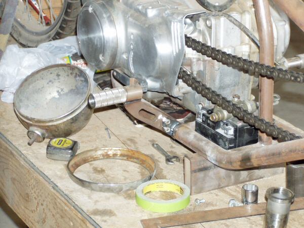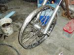 21" x 1.4" front rim (hard to find) on a custom hub to use dual 5" quad rotors. 19" x 1.8" rear rim (started life as a front) on a custom hub.
