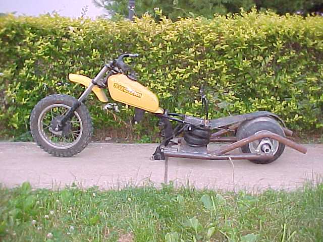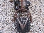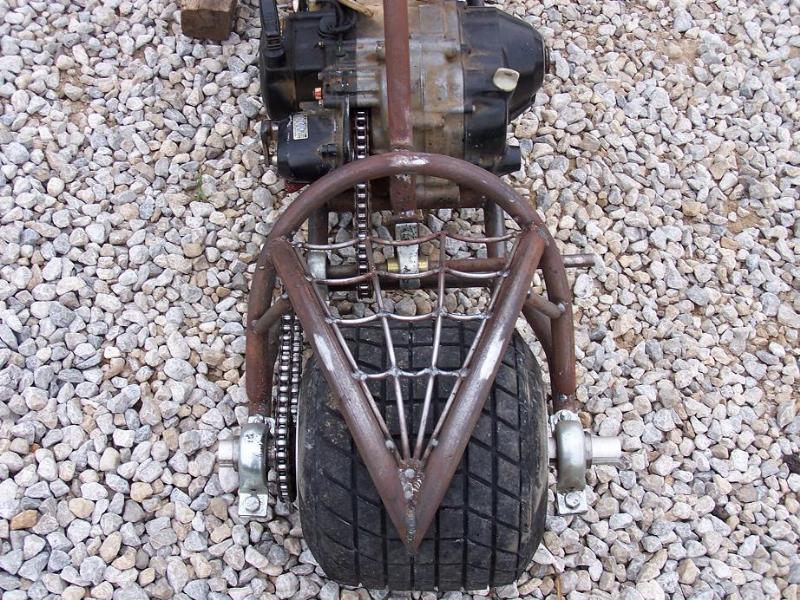 85" long, curved upper and lower backbone, 56 degree rake, 3 wheeler gas tank for now, building a new tank now, spiderweb gusset, and seat pan, jackshaft, and rigid as a mofo. Drag bars Tops out at 54 MPH