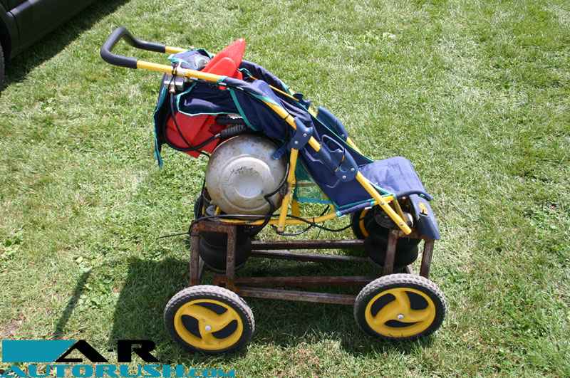 Fully Air Bagged for front to back. All 1/4" lines plummed into some old ass MIC manual valves. Also have a 5 gallon air tank with the words, "DROPPED AT BIRTH", on it. The entire frame is hand built with 1" square tubing. The entire frame lays out and gets a good 7-8" of lift.