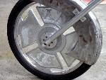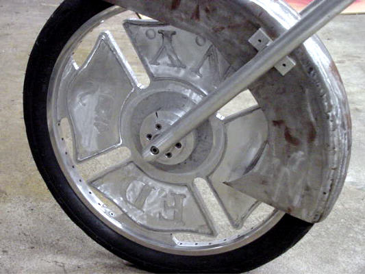 10x6 chrome wheel on the rear with a DOT approved 205/50/10 tire, Front is a self milled 20" aluminum relica of the Fireman Bike wheel with a Mongoose Flame tread tire.
