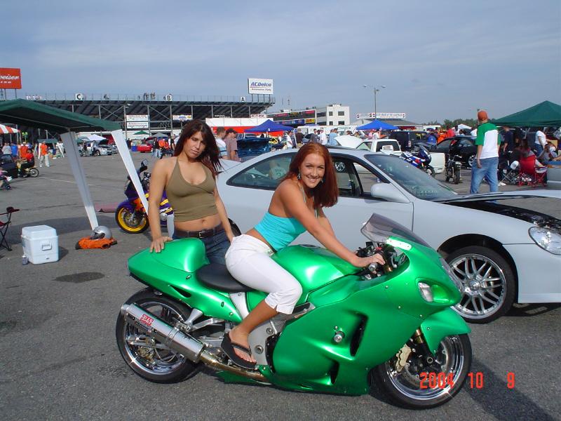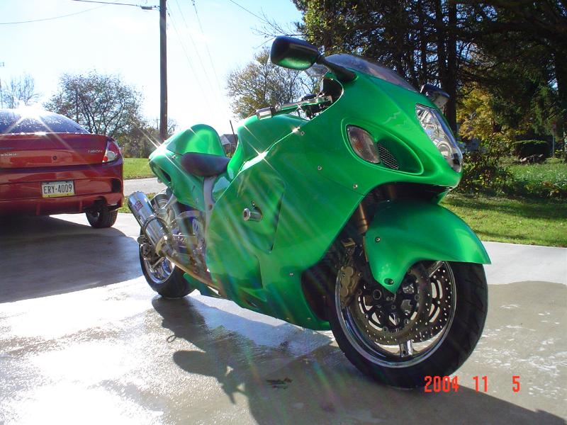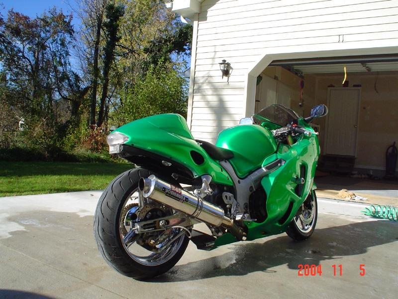 candy lime green paint, tons of chrome, extended swing arm, all aftermarket lights, full yoshi exhaust,