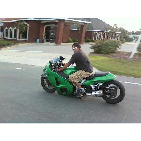 12 inch stretched swing arm, Some PPG Green I liked, Sportech Benjamins Windscreen, Chrome Spikes, Cut tail section, removed trunk, and Drag Specialties chopper tail light so it lays.