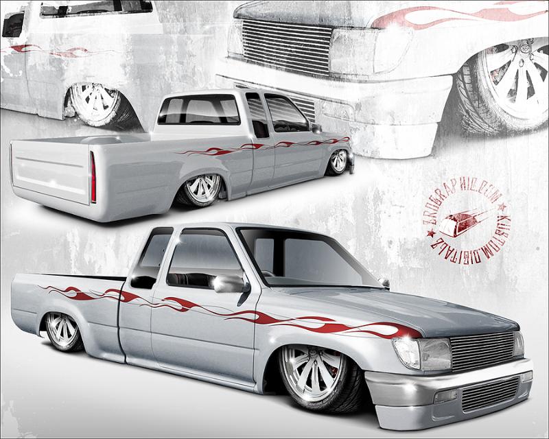 Shaved handles, antenna, tailgate, fuel filler, smooth bed floor, caddie tails, grant kustoms bumper, 2.5 inch body drop, 97 - 00 tacoma headlights and corner lights (thanks to kyle for hookin me up), billet insert, suicide doors