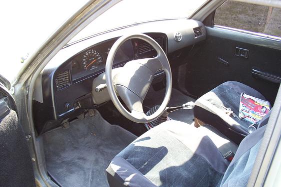 Corolla bucket seats, black carpeted door panels, midnight blue dash, carpeted floor, Honda Accord console