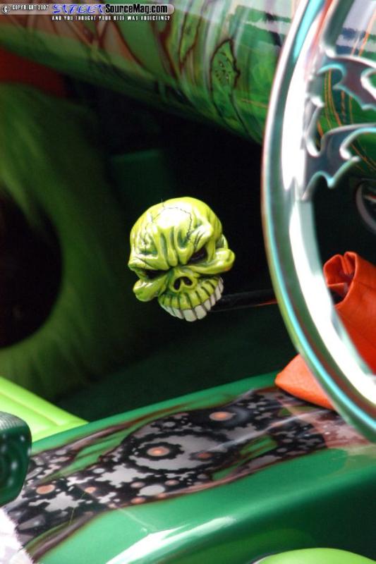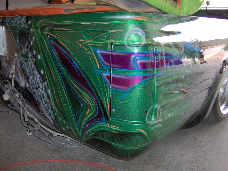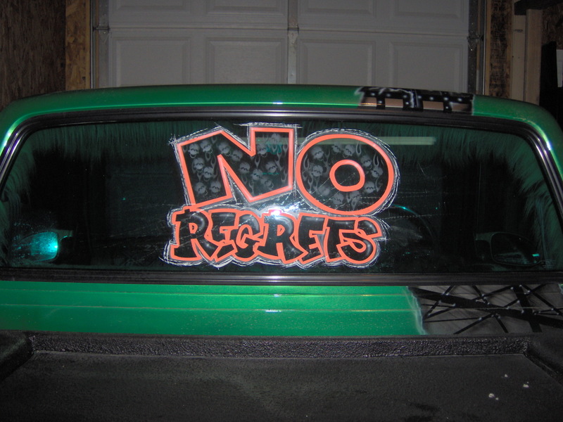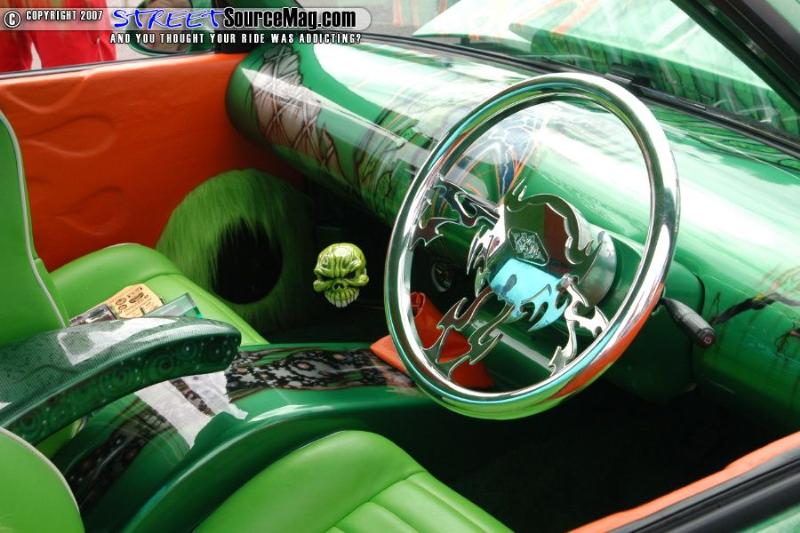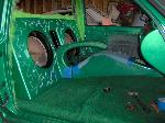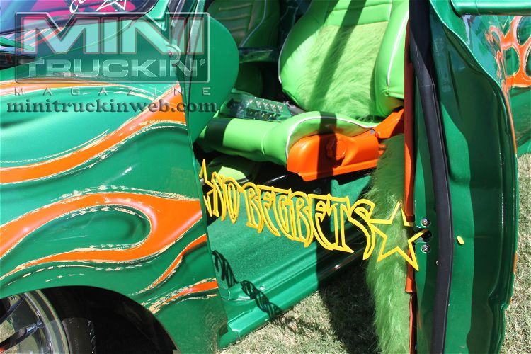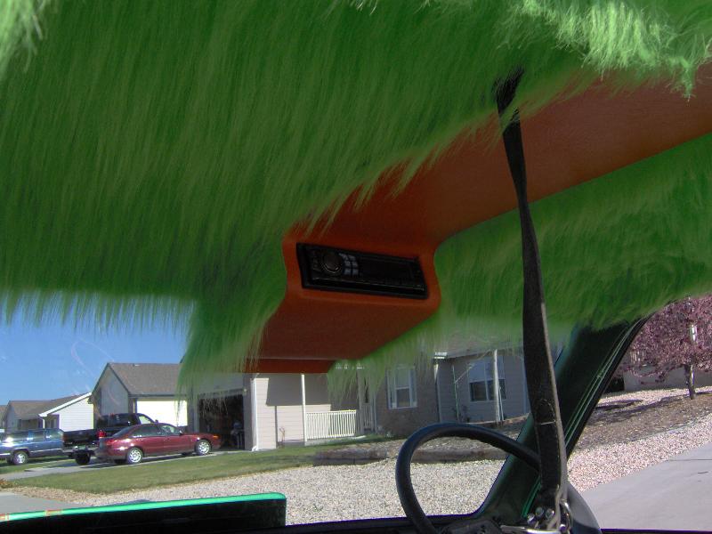 celica bucs green vinyl with a trol hair insert,headliner green trol hair, Door panels orange vinyl and green trol hair , Over head console houses the alpine radio and is orange vinyl and green trol hair, carpet will be green,dash is painted and blank no gauge no radio no nothing moved the ignition switch from column to a nice hidden spot.billet wheel,and misc painted parts. behind seat sub box that houses 2 pioneer 12" subs in a ported port thought cab box. With a fiber glassed face and center console finishing touch.