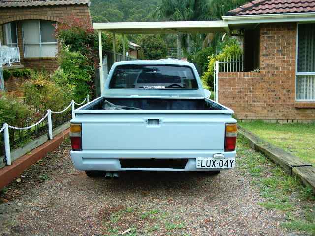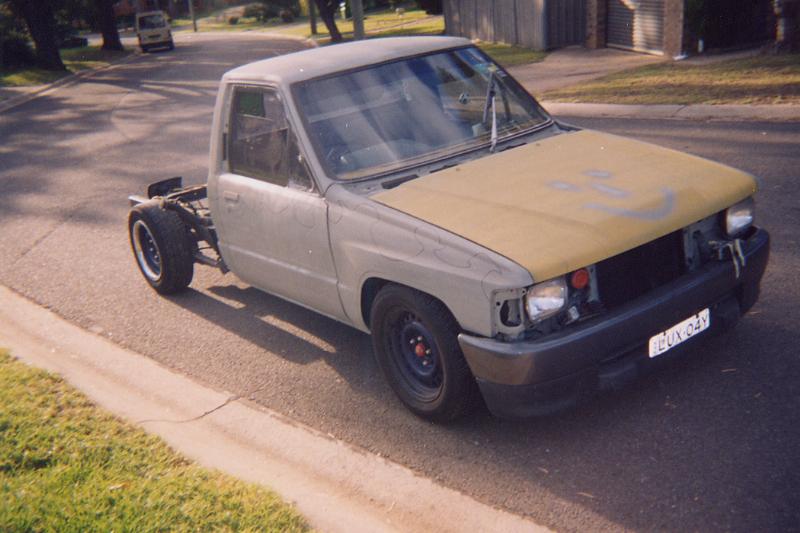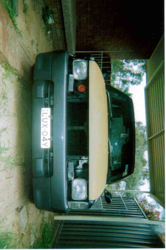 Was a Midnight Metalic Blue and then an undercoat gray. Now a Jet black and Burnt Orange. With a nice big hole cut in the bonnet, pushbike mirrors and a welded up tailgate