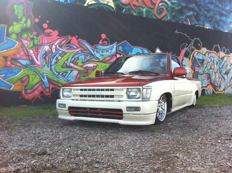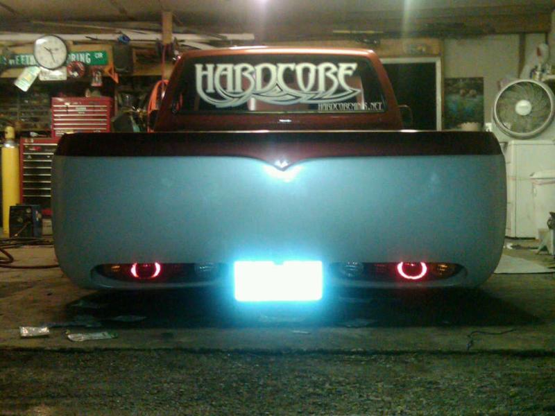 Two tone copper up top with some flake and escalade pearl white on the bottom. Shaved rear tailgate Toyota Supra brake lights molded in to bottom roll pan. Shaved handles, squirters, gas door.