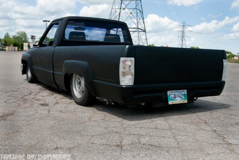 4x4 fenders, 4x4 fiberglass US box, Trenz phantom grill, 89/92 triple chrome bumper, clear lens, shaved handles antenna & fuel filler. Black motorcycle mirrors.