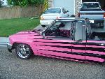 Shaved dash, fuzzy hairy pink leopardy and black door pannels, chrome shift knob(YEAH!) some other painted peices and stuff.