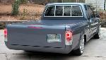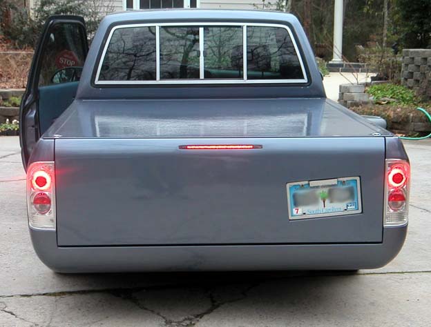 Phantom grille with diamond back headlights behind it. 4x4 fenders with clear lenses, side markers. Chrome bumper/valence with billet insert. Celica mirrors. Tinted windows. Tacoma Altezza tail-lites molded in. LED 3rd Brake light. Tailgate skin with angled plate box. Rollpan. Shaved doors, antenna hole, gas door lock, rock guards. Sunroof. BMW Steel Blue Metallic paint!