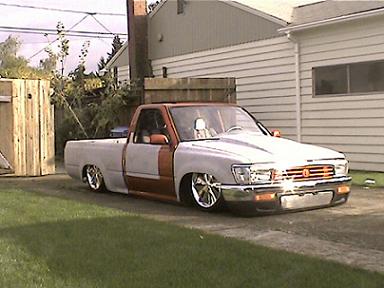 4 runner front end, cowl hood, shaved antenna, suicide doors, sliding rag top, shaved door handles, shaved and molded in tailgate, l.e.d. tail lights, and a custom license plate box