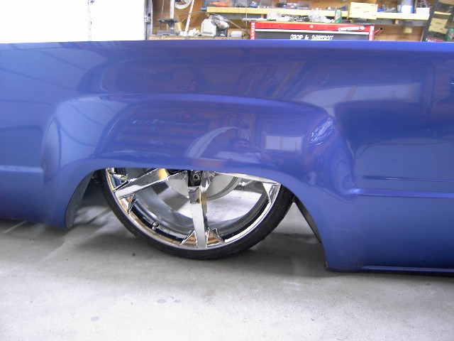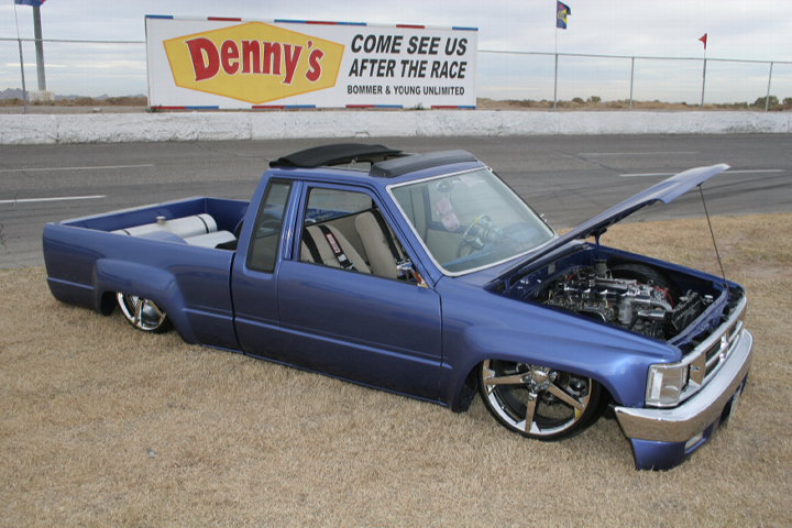 3"Bodydrop. 88 4wd chrome grille. 4wd Fenders. 97 4wd Tocoma bumper and valance. Clear corners. Stock hood,no supports cut. No motor drop. Shaved hood squirter, wipercowl, antenna, gas door, doorhandles, locks, taillights, body seams, rear corner bodyline. Rear Combo Skin.Graft 4wd front fenders to bedsides. French LED trailer taillight. Popup license box{air}. 40x30 ragtop. Harley billet mirror with blinker. MAS Racing Products 14 gallon spun aluminum fuel cell.