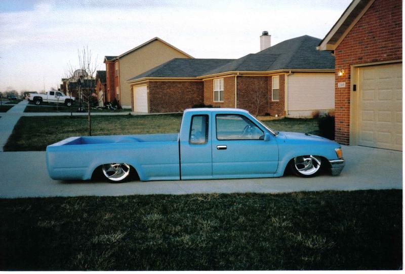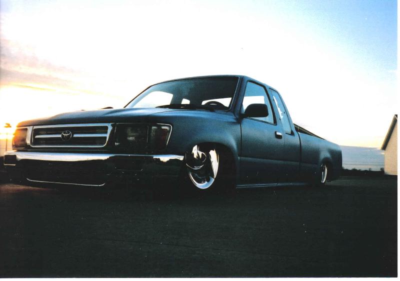 baby blue suede primer with 4runner goodies and toyota supra taillights. Oh don't forget the long bed that toyota forgot to put on the 89-95 xtra cabs.............Grant Fab combo with Supra buckets,Sir Michaels license plate box, shaved gas door, 4WD front fenders, SR5 chrome mirrors. 4 runner grill, headlights, bumper and valence.
