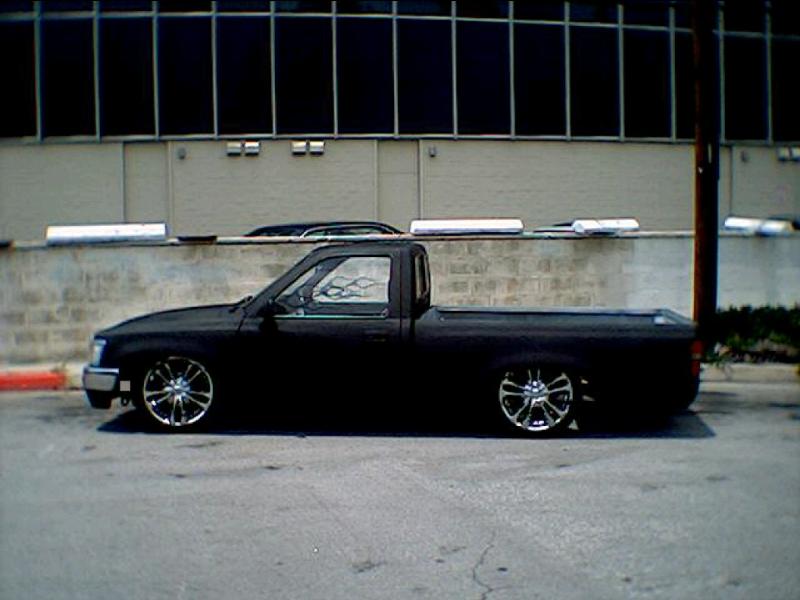 full 95 4runner front, clear corner and bumper lights, 4x4 fenders, shaved rocker holes, antenna, door handles, tailgate handle, 3rd brake light, hood pissers, welding in and molded rollpan, custom license plate, gaylords bed cover. 5% window tint with mirror flames (but changing the design..this was just a practice tint)