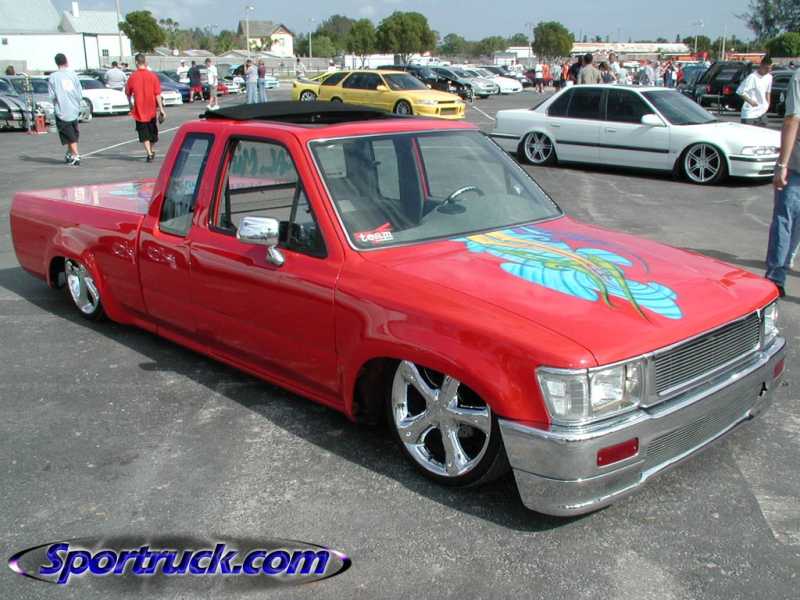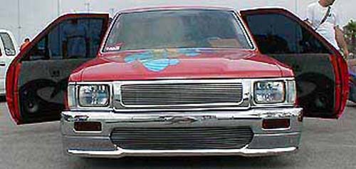 Toyota Super Red paint, graphics on hood, cowl and tonneau cover, shaved:hood squirters, antenna, wipers, rock guards, tail lights, tailgate, door handles and gas door. suicide doors, l.e.d. tail lights, flip down tag in the tailgate skin with the new gas door behind it, sliding ragtop, fiberglass tonneau cover, 4x4 fenders and all chrome 4x4 bumper, valance and grille with billet insert