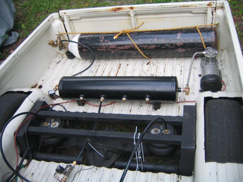 Stock up front for now. in the back 2 linked, with slam specialities HE-7's, with asco nickel plated 1/2 valves. Only 2 for now gonna have 16 when the trucks fully done.